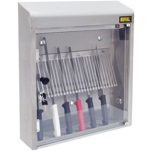 Armoire à couteaux en acier inoxydable Buffalo, pouvant contenir jusqu'à 15 couteaux, conçue pour réduire la contamination croisée. Minuterie réglable et porte transparente. Les lampes UV s'éteignent automatiquement lors de l'ouverture de la porte. Fixations murales.
